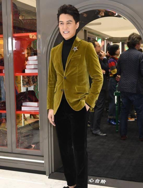 要注重面料和颜色的挑选。比如靳东身穿的这件丝绒面料的“贵族黄”西服,内搭黑色高领毛衣,下半身搭配黑色丝绒西裤,再点缀胸针,尽显优雅绅士风度。